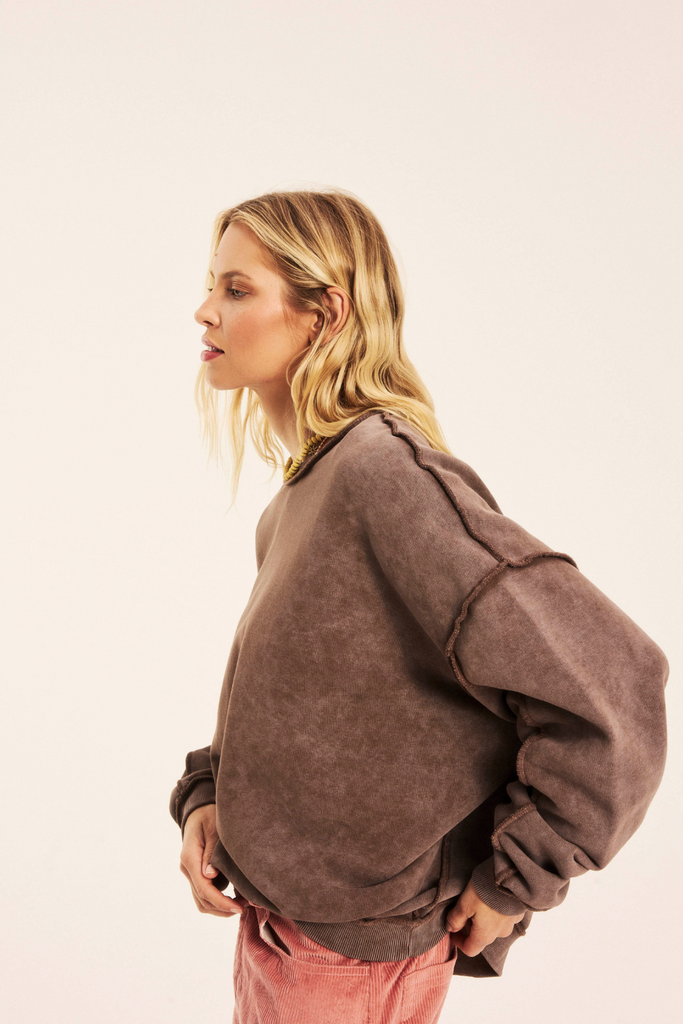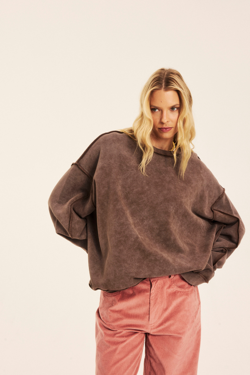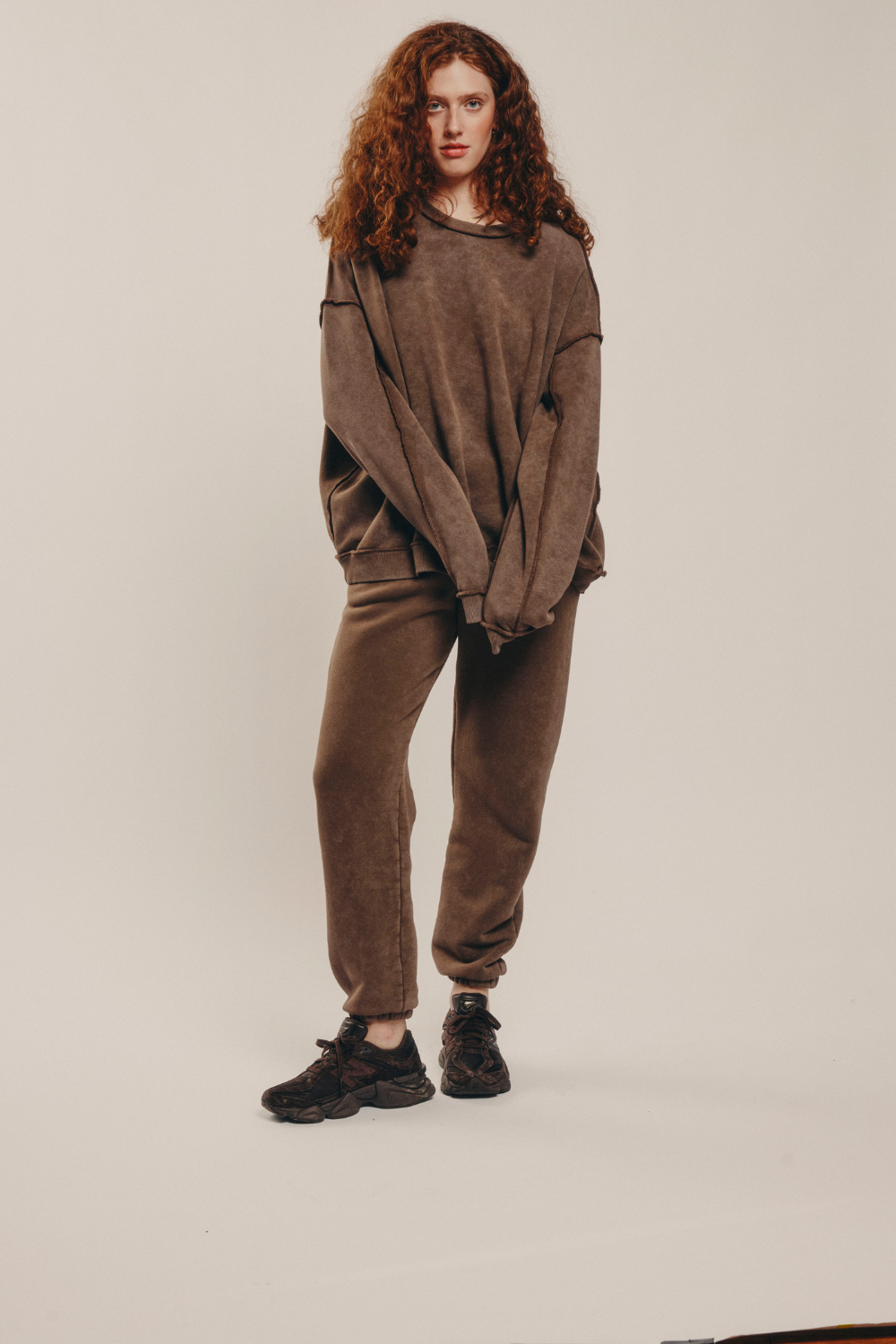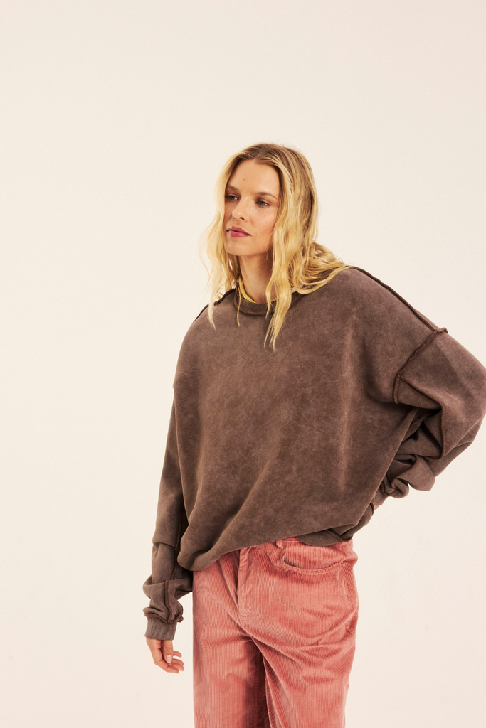 Jumbo Rough to najnowsza wersja Waszej absolutnie ulubionej bluzy w Bohemi Soul. Jak zawsze jest to mocno oversize’owa, luźna propozycja, charakteryzująca się dekoltem crewneck oraz wydłużonymi rękawami z mocno obniżoną linią ramion. Wersja Rough ozdobiona została natomiast grubymi szwami wykonanymi „na lewą stronę”, które dodają bluzie mocno streetwear’owego vibe’u. Jumbo w naszym nowym brązie Choc Delight wykonana została z drapanej bawełnianej dzianiny dresowej, której specjalne opranie w wysokiej temperaturze nadało niepowtarzalnego, podniszczonego stylu oraz niezwykłej miękkości. Naszą nową Jumbo noś w komplecie ze spodniami Vermont z tej samej dzianiny lub połącz ze swoimi ulubionymi jeansami.